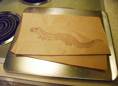 Poner una hoja de papel de supermercado marrón sobre una hoja de galleta. Lugar Falcor en el papel para evitar que se pegue a la bandeja metálica.
