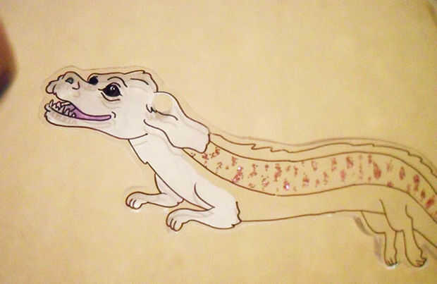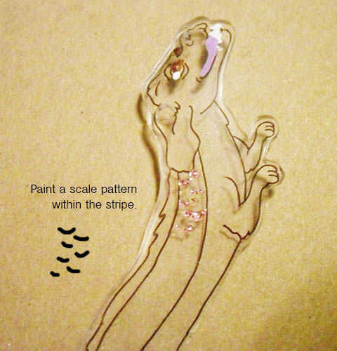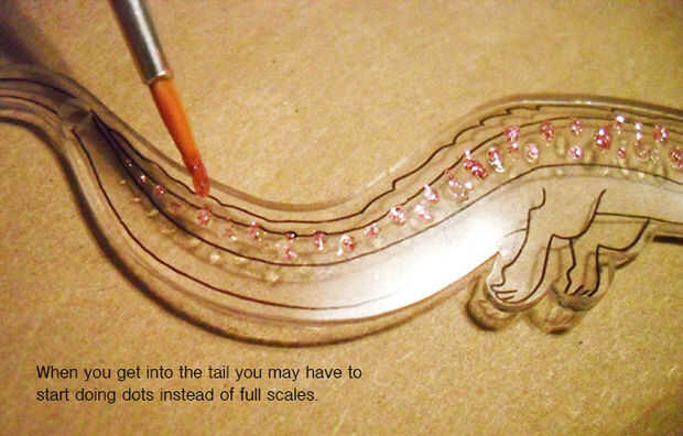4) apliqué una red de escalas en forma de media luna vas hacia abajo de la raya del cuerpo. Como la cola más delgada, recurrí a puntos de brillo.