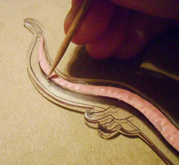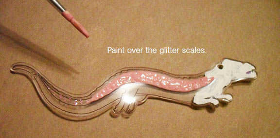 Si has permitido para un área de escalas (pueden verse en algunas tomas de la película), creo que es una gran oportunidad para algunos brillo. Recomiendo marca Stickles. Ya que el trabajo que estamos haciendo es tan minúsculo, arroja a chorros algunos brillo hacia fuera en algún papel de desecho y utilizar mi pequeño pincel para aplicar el it Incluso la punta muy fina de la botella de brillo era demasiado grande.