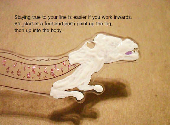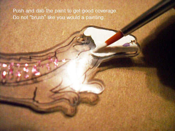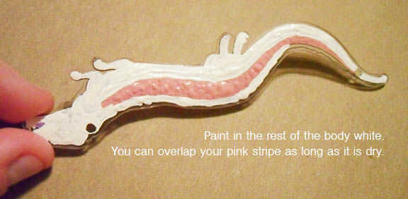 7) cuando es seco, ir con blanco y rellenar el resto de su cuerpo. No tenga miedo de traslapo de pintura ya que es su color final. Flip para verificar si hay errores. Si fue fuera de las líneas puede hacer limpieza fácil con la punta de un palillo de dientes.