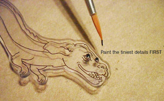 1) comienzan con las características más pequeñas, en este caso, los ojos y los dientes. Con el pincel más pequeño tiene, o el punto del palillero,punto de pintura en las áreas o los ojos y los dientes.
