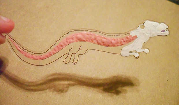 3) una vez que son secos, moverse en las siguiente características más grande, en este caso el iris y lengua. No importa si algunas de sus gotas de color de lengua en los dientes de color porque sus datos de dientes blancos ya están en marcha. Ya que nuestro trabajo de línea en la parte frontal del plástico, nada que hacer en la parte posterior oscurecen los detalles.