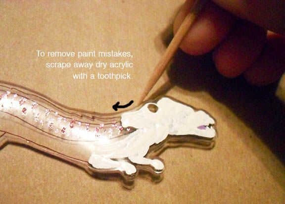 5) mientras que las escalas de brillo secan, puede pintar en el blanco de la cabeza y las patas. Ya que están en un extremo de la pieza hay poco riesgo de manchar su brillo húmedo.