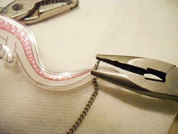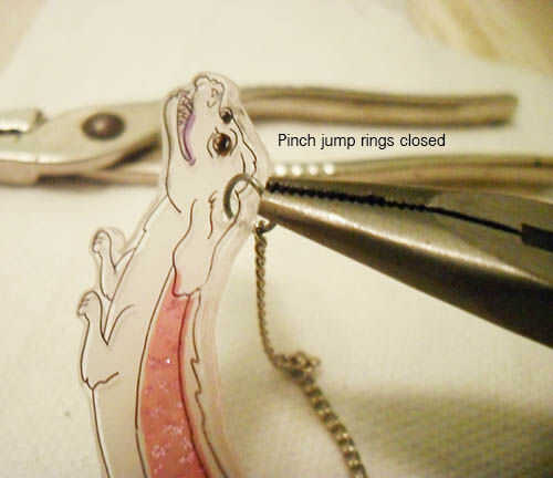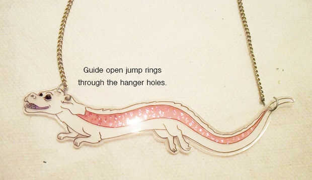 Ahora hilo cada anillo del salto a través de los agujeros de suspensión correspondiente en tu personaje. Asegurarse de que sus anillas se extienden suficientemente ancha como para caber sobre el grosor del plástico de la. Tratar de forzar un anillo del salto demasiado apretado en el riesgo de rasgado o saltar su trabajo de pintura con los extremos afilados de metal.