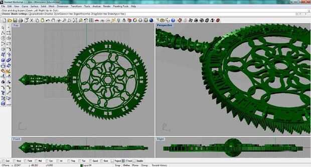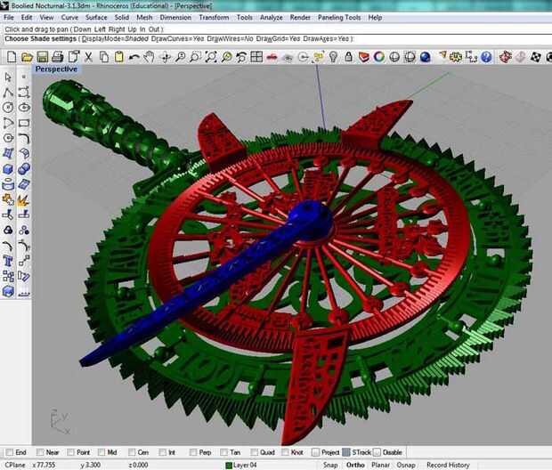 Estos objetos 3d se construyen de muchas piezas. Por ejemplo, el componente verde tiene 365 formas geométricas dispuestas simétricamente alrededor de su circunferencia, sólo para los días. El número total de componentes en el modelo 3d de stardial es aproximadamente de 1.000. No es tan difícil modelar como uno podría pensar. Por ejemplo, las 365 unidades alrededor del perímetro son sólo 73 conjuntos idénticos de 5 unidades.