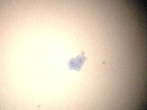 - Poner la diapositiva en la platina. Moverse alrededor y ajustar el enfoque hasta que encuentre algunas células agradables. El citoplasma debe mancharse de color azul claro, los focos algo más oscuro.