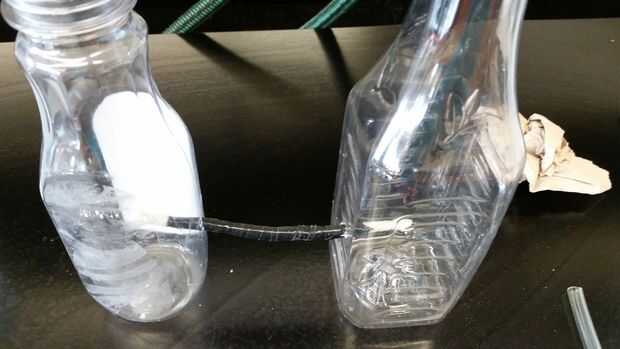 Después de hervir, empujé los extremos de la cuerda por cada uno de los agujeros en las botellas de plástico para conectar los dos juntos y ver si la cuerda era la longitud correcta. Cuando me sentía satisfecho con la longitud de la cuerda, yo envuelto en cinta aislante y luego conducto cinta para evitar fugas. He pegado a los extremos de la cuerda en las botellas y luego caliente había pegado el resto de los agujeros. Sin embargo, el pegamento caliente no funcionó como previsto, así que tuve que usar silicona para bloqueo completamente en el agua de manera que no habría ninguna salida cuando agregué mi líquido de cátodo.