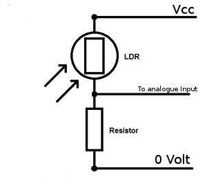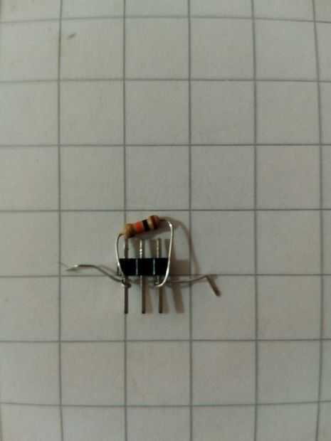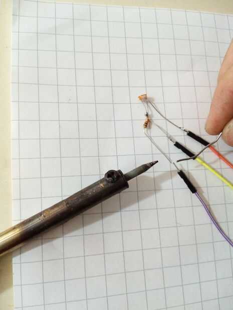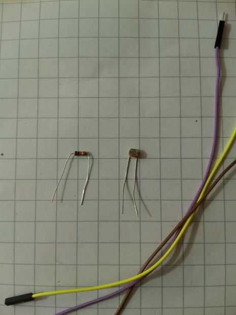 - preparar el sensor de luz , para soldar una resistencia de 10KOhm a uno de sus pines (como se muestra en la figura); el perno resultante entre la fotorresistencia y el resistor de 10K será la señal