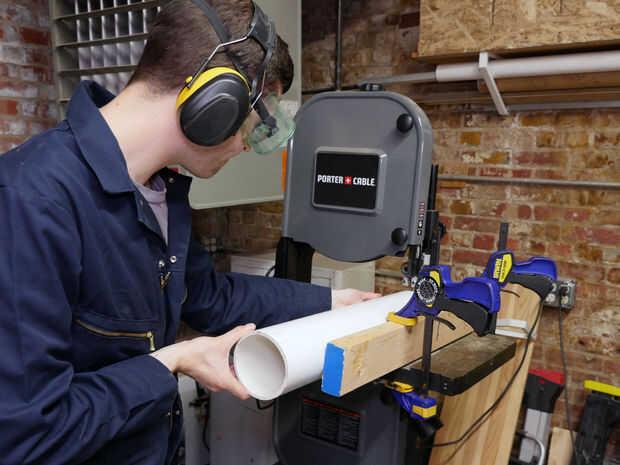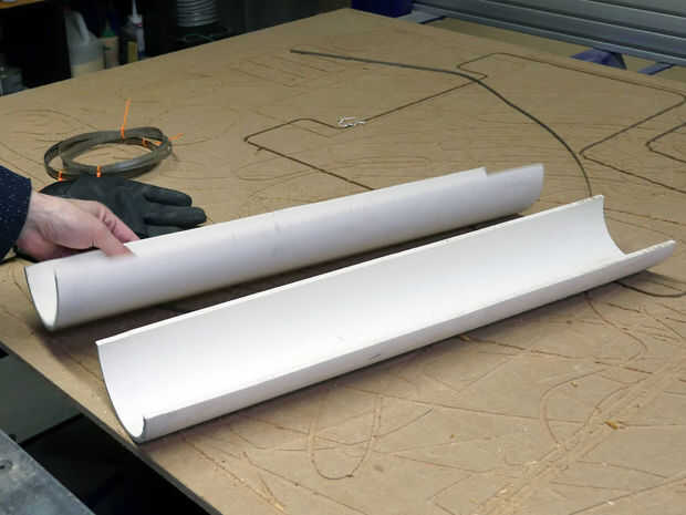 Los tubos de conexión de la rampa se reduce a la mitad con una sierra de banda.