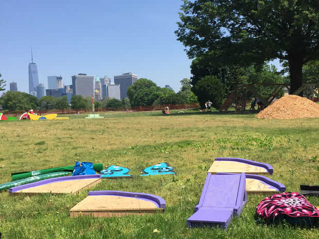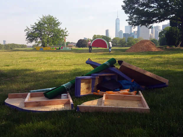 Hemos cargado nuestras piezas en el ascensor, en una camioneta, luego en un camión, luego de un camión antes de montar en su lugar. Nos llena de pelotas de golf para probarlo, repuesta pintura para retoques (por supuesto los camiones proporcionan unos golpes aquí y allá), la alfombra verde y un cubo de herramientas.