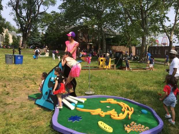 un campo de golf portátil fijado mis hijos y diseñado y construido para guerrilla improvisada juegos en demanda - cualquier parque, cualquier momento.Suministros incluyen cerca de 30 hojas pequeñas de fieltros y 18 hojas de fieltro blanco llano y tac