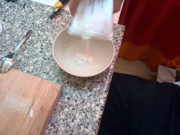 Una vez que ha hecho este dióxido de titanio "goo" sacar un poco de la taza con la cuchara y colocar en el plato, intenta difundir hacia fuera un poco pero no se llega a cerca de los bordes.