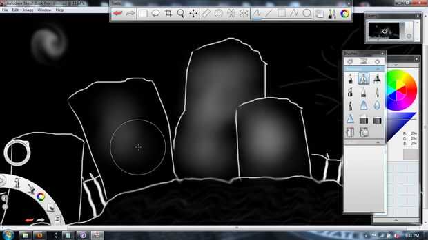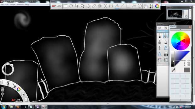 , Establecer el color a un gris claro, establecer el tamaño de aerógrafo a aproximadamente 74 y el flujo al 30%, luego rocíe algo de vida en las lápidas.