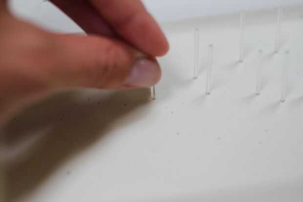 Para transferir mi patrón a la arcilla, copié la constelación sobre un pedazo de papel y coloca sobre la arcilla. Luego usé un alfiler para hacer un agujero en el barro. Después de quitar el papel, utilicé las varillas plástico más grandes, cortadas en segmentos de 1 pulgada, para representar a la constelación.