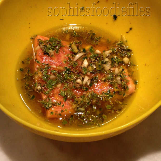 la receta (aquí, adaptado de un anuncio vino) llamado para cortar el salmón en tiras antes de asarla, pero encuentro que cocina intacto resulta en una mejor preparación y presentación. También, varios pinchos (metal o madera) facilita a los peces.Par