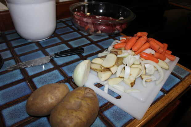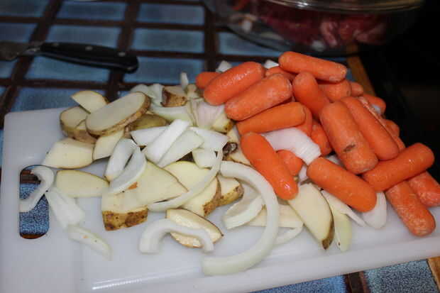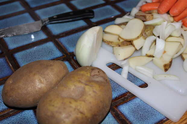 Cortar cebollas, patatas y zanahorias (utilizar zanahorias y sólo arrojó en su totalidad)