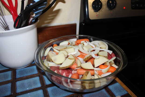 Agregar papas, zanahorias y cebollas por encima de la carne de vacuno.