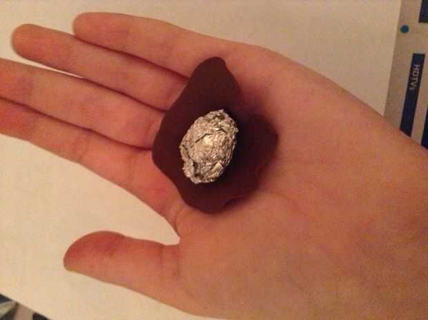 Ahora enrollar la arcilla marrón aplanada alrededor de la lámina de estaño, con no de la hoja un pico a través de.