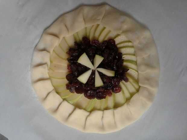 - Coloque rebanadas de manzana en círculo concéntrico, ligeramente superpuestos. Asegúrese de dejar suficiente de un borde a doblar la corteza ligera para hornear. Dependiendo de cómo es grande sus manzanas fueron, a veces puede hacer más de un círculo.