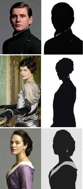 Con la imagen base creada me puse a buscar imágenes de los personajes. Busqué específicamente una pose que podría decir era ese personaje aunque fuera solo una silueta. Algunos de los personajes en Perfil de otros en poses de pie y algunos otros lo hice recto destacando detalles en su vestuario para ayudar a identificar el carácter. Como Bates con su bastón o delantal de Mrs. Patmore y capa de controladores de Tom. Con imágenes recogidas que recortar fondos y comencé relleno sombreado o en la persona como necesario para crear las siluetas. Para este juego de decoración del empavesado decidí tan solo tendría 3 citas por personaje, procedente de cotizaciones en línea hasta que tuviera 3 para cada uno que me gustó. También decidí, mucho como el diseño de la viuda, necesito un diseño de espaciador. Que utiliza el logo de imagen de espejo blanco y negro silueta de Downton Abbey para, pensé que equilibrado los otros imágenes muy bien.