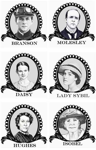 El siguiente aspecto de diseño fue para el tablescape, creé cameo imágenes de estilo de los personajes pero yo quería que se parecen más a los bocetos de retratos. Hice una plantilla de base para el marco cameo y que hecho lo sobre abastecimiento fanart de Downton Abbey en la web. DeviantArt tenía algunas piezas extraordinarias; realmente quedé lejos por algunas de las cosas que anda por ahí. En algunos casos, utilicé fotos de publicidad cuando no pude encontrar nada artístico que encajan con el aspecto que estaba tratando de lograr. Los alteré públicamente las fotos en Photoshop para ver como bocetos. Fue variando los diseños pero creo que todos trabajaron bien en blanco y negro. Imprimí ellos fuera en papel fotográfico un corte les fuera a caber en el bud jarrones/carné había sacado para usar en casa.