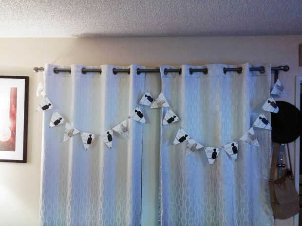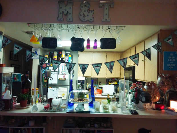 Entre cocinar porciones del desayuno colgué mi Escribano en las cortinas de la sala de estar, que mi marido amoroso tan amablemente había colgado para arriba para mí ese día. Y en el área de buffet de la cocina, mi marido usa algunas pizarras había recogido en la sección de dólar en blanco y aparece las opciones de bebida 3 tema, colgamos de las parrillas de barra-ware en el buffet. He usado extra del empavesado del tema hasta la sala de baño. Grabar algunas banderas al espejo y colgante del empavesado a través de la cortina de ducha. Era tonto pero pensé, por qué no!