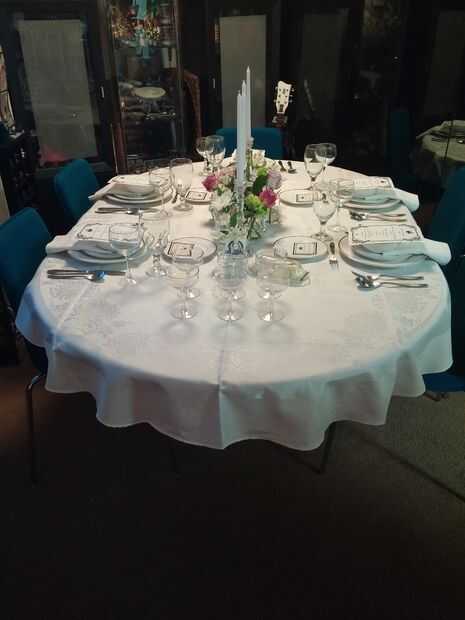 Puse luego de trabajar en mi mesa; Había limpiado el candelabro de plata el día anterior y compró una caja de velas cono blanco de destino. Puse el paño de tabla y coloca el Candelabro en el centro, flanqueando en cada lado de la vela de cristal de Tiffany se pega. Recortado por las flores que había comprado de Trader Joe (un surtido de rosas violetas y otras flores, que no se puede superar para $6) en cada uno de los 12 bud jarrones/tarjeteros y colocado alrededor de la base de los candelabros. He añadido las imágenes del cameo de carácter que había diseñado a los brazos de soporte de tarjeta en cada vaso. Entonces creé la configuración individual del lugar. Tradicionalmente, habría sido aún más cubiertos con fines muy específicos, como un desierto cuchara y tenedor, cucharita de café, etc.. Mi set de cubiertos no tiene todos los elementos necesarios así que improvisó y modificar mi configuración para acomodar.