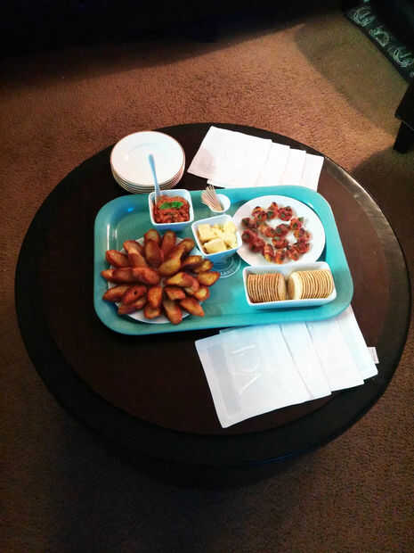 También figuran los aperitivos en nuestra mesa de centro/otomana y servido en una bandeja de metal azul que recogí en Ikea por $12. El azul de la bandeja emparejado el azul en el empavesado que había hecho como decoración, ¿cómo pude pasar encima de?