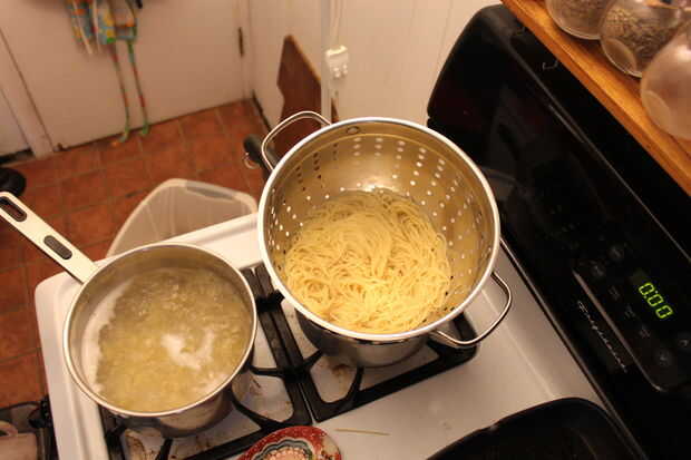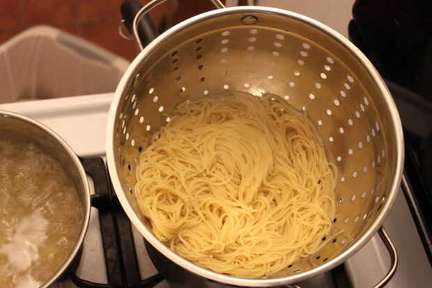 Por ahora la pasta estará lista. Tire de ella fuera del agua y escurrir bien.