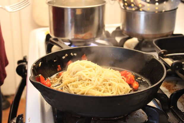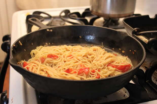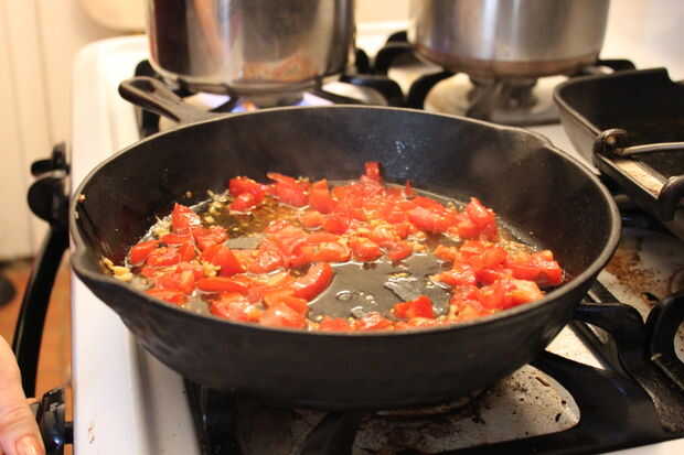 Añadir los tomates a la sartén justa un momento antes de agregar la pasta. Desea los tomates calienta pero no cocina. También, añadir 2 cucharadas de agua de la pasta a la sartén. Hará que el líquido extra para una mejor cobertura de sabor a la pasta.