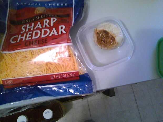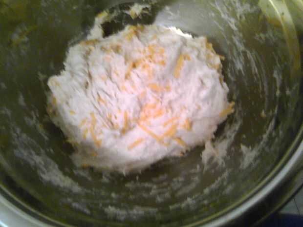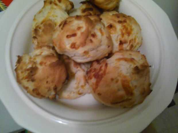Utilizar cualquier receta de galletas que te gusta. Un poco estaba presionado por espacio tiempo y cocina, así que opté por hacer trampa y usar Bisquick. Una vez se mezcla con la masa, en algunos ajo y echar una mano grande llena de queso cheddar rallado. Mezclarlo todo muy bien. Colocar la masa sobre la bandeja para hornear y hornee a 450 grados durante 8-10 minutos hasta que estén ligeramente doradas. Servir con un poco de mantequilla.