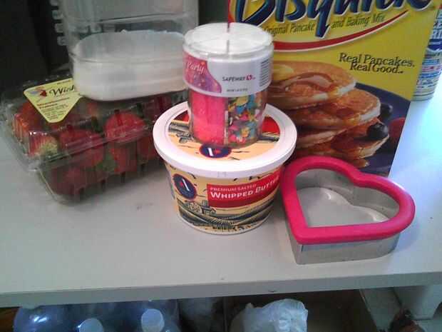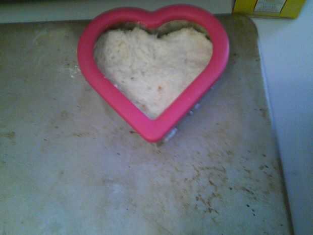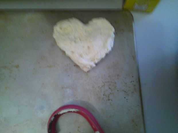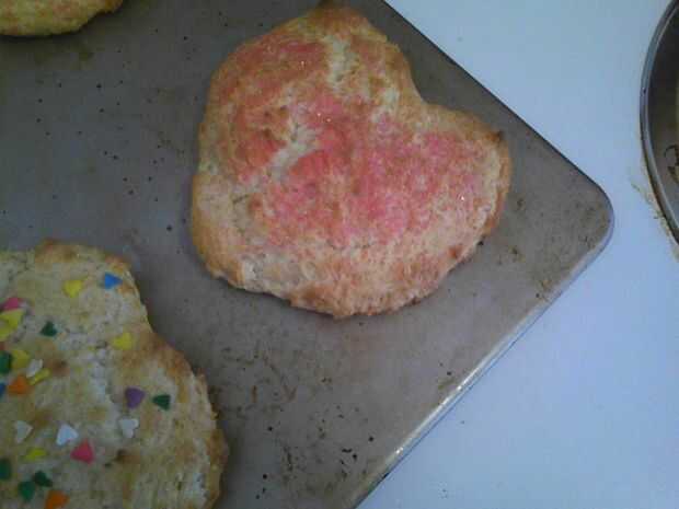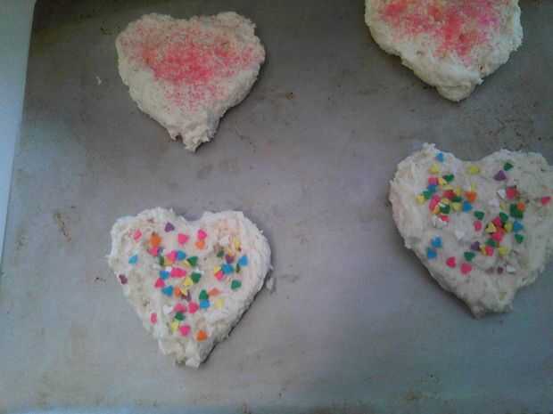 Una vez más, sólo presiona espacio tiempo y la cocina, utiliza Bisquick. La receta dice que al dejar caer la masa sobre una bandeja para hornear galletas. Tengo un cortador de galletas en forma de corazón que cuchareó la masa en y entonces presiona alrededor de llenar en la forma de corazón. Pude hacer cuatro mantecados. Para un toque especial, agregué chispitas de color rosas y en forma de corazón en la parte superior. Hornear hasta que estén doradas.