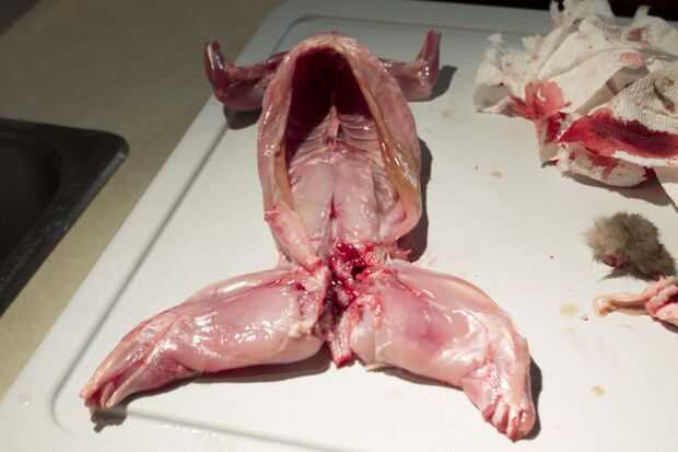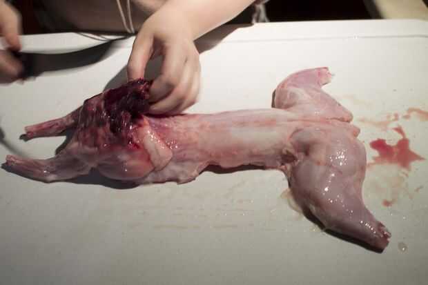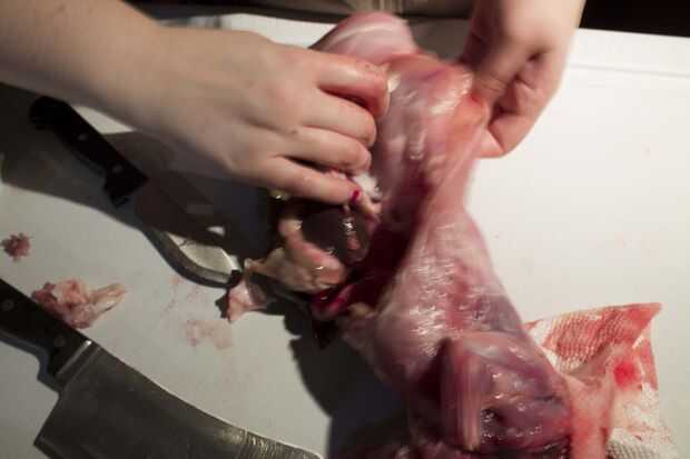 Como con la piel, pellizcar el tejido alrededor de la parte inferior del abdomen y haga una incisión cuidadosa, debe ser capaz de ver los órganos caen lejos de la capa de tejido que se corte por su propio peso y colocar en la parte posterior de la canal.