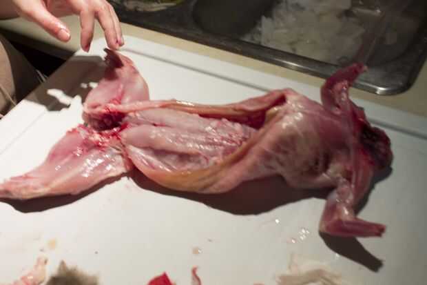 Ejecutar el corte a la longitud del abdomen para el esternón. Debe haber dos carnosas aletas a ambos lados de la bolsa de intestino que ha colocado a lo largo de la columna vertebral.