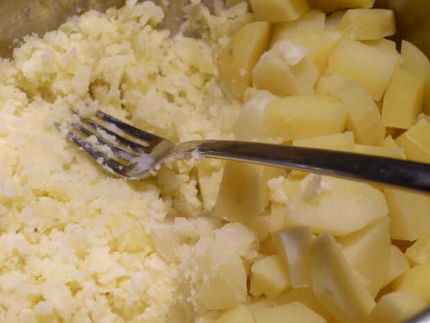 puré el cocido patatas y mezclar con leche, la sal y la mantequilla