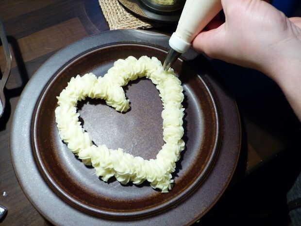 Llene el puré en una Manga pastelera y tubo un heartframe en las placas