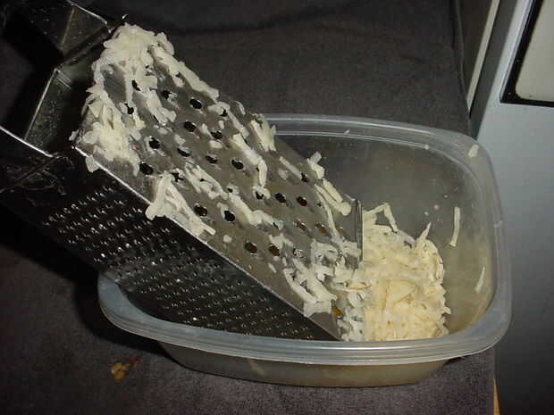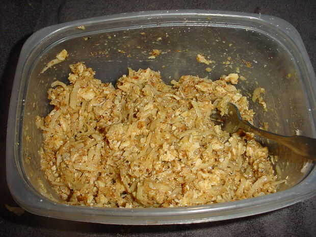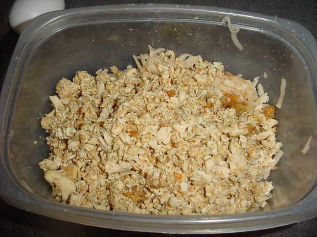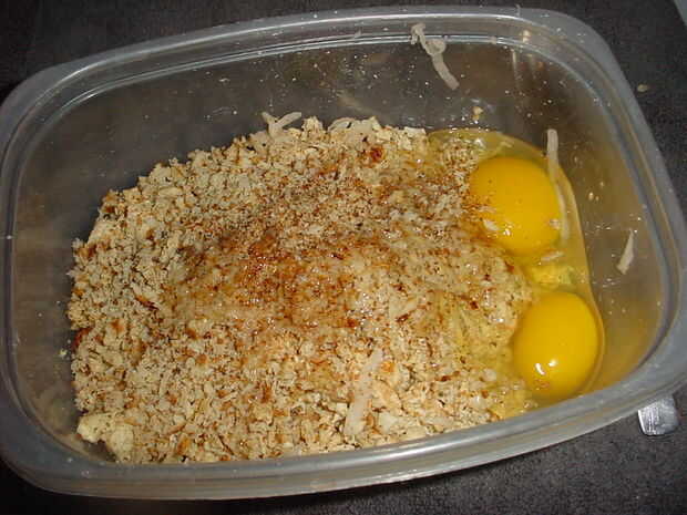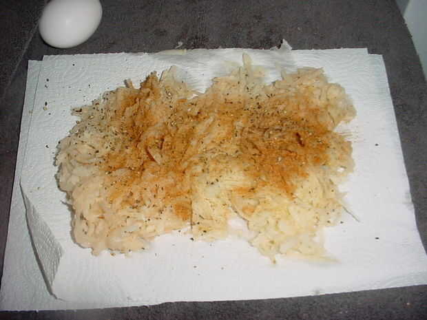 Generalmente no pelar mis papas pero estos fueron el fondo de la bolsa para después lavarlas pelan les y quitar cualquier manchas oscuras. Utilizando un accesorio rallador para el procesador o en este caso el rallador manual probado y verdadero de la caja, rejilla de sus papas. Si usted tiene un tazón de fuente que el rallador cabe en usted puede ahorrar un poco el tiempo de limpieza. Pone tus papas ralladas en un papertowel doble para absorber humedad y temporada con sal y pimienta y en este caso barbacoa condimentos. Proceso o picar la pechuga de pollo sobrante finamente y añadir al bol de las patatas, añadir unos 3/4 de taza de pan rallado para hacer su propia, tostar unos pedazos de pan y procesar con aderezo italiano, añadir los huevos y mezclar todo bien