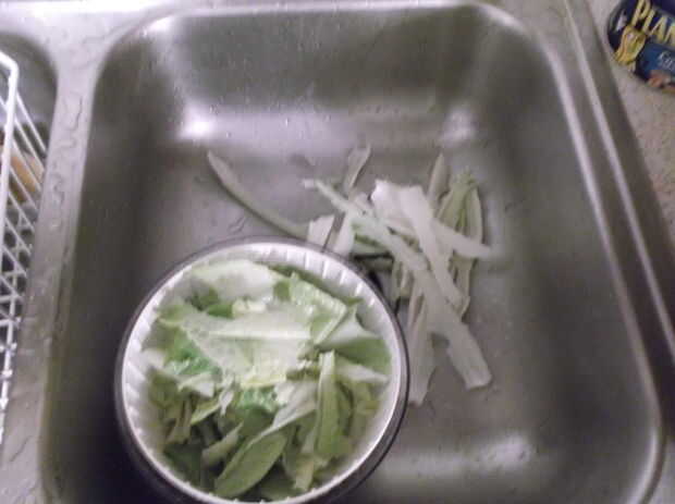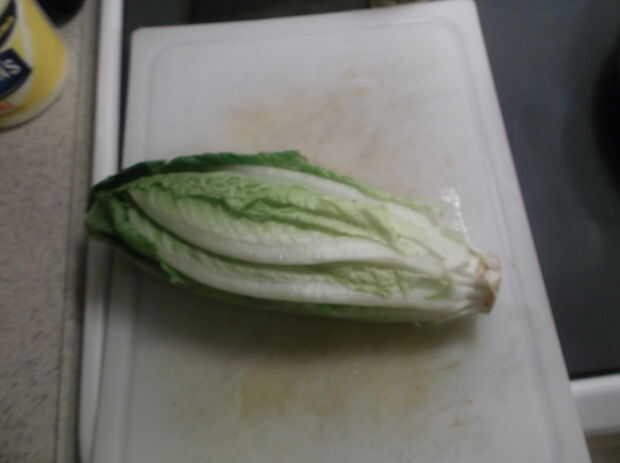1) cabeza de lechuga romana. Solo consigo las cosas en las bolsas de plástico de tres pack. Lave, corte en trozos de tamaño de la pieza (descartando cualquier hojas duras o repulsivo, o costillas enorme). Poner en la ruleta y seque el heck fuera de ellos. Hojas secas sostienen el apósito mucho mejor. Y las hojas pequeñas en el centro son la mejor parte. Generalmente hacen girar las hojas. Déjalos reposar 10 mimnutes, vaciar lo spinner tazón de fuente debajo de la canasta spinny y luego hace girar otra vez. Es increíble la cantidad de agua proviene de lechuga que dejas solo "colador seco."