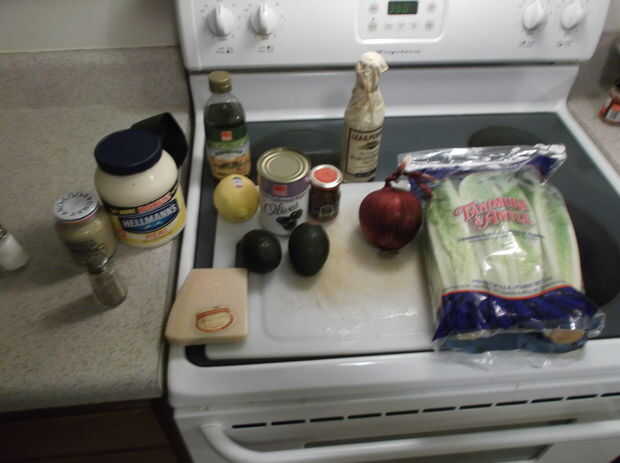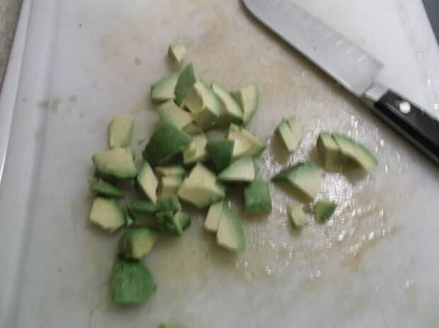 11) media un aguacate maduro de big(ish) o de un pequeño. Picados en 1/2 pulgada por 1 pulgada de piezas. Puede guardar el resto de la palta para mañana poniendo en algo de Tupperware de plástico de tamaño adecuado y rociar algunos del jugo de limón adicional sobre las entrañas expuestas.