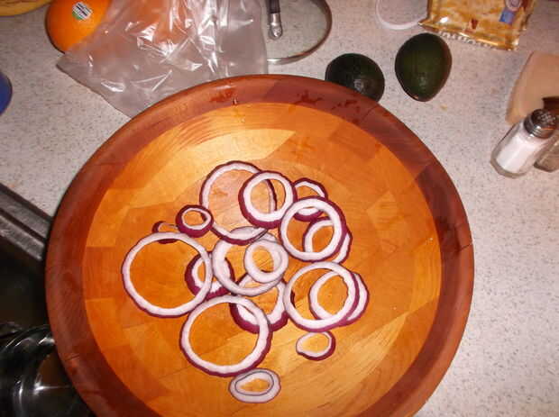 10) cebolla roja. Lonchas finas de papel. Deshacerse de la parte de piel exterior repulsivo.