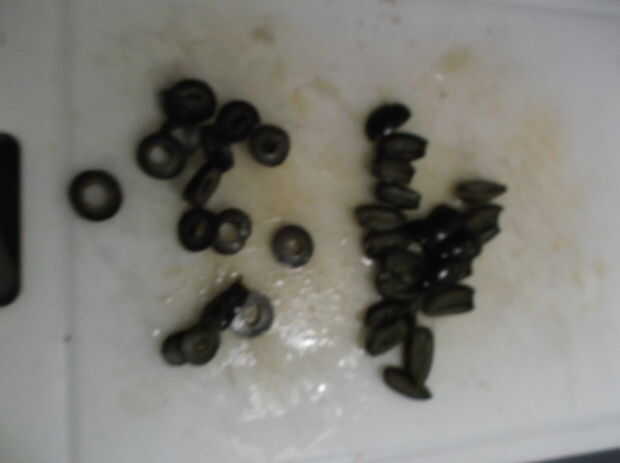12) aceitunas negras. Tiendo a llegar un poco perezoso y uso los enlatados picados unos. Corte una docena o más en dos mitades. Si son energéticos, o tiene algunos ahí, una media docena de la "nueva" clase de aceitunas Kalamata tiernizada son grande. Para prepararlos, cortar de un lado para romper la piel, romper con el lado de su cuchillo, saca del hoyo y les cuarto. Tienen un sabor más fuerte, por lo que no usamos tantos. Pero lo que te hace feliz.