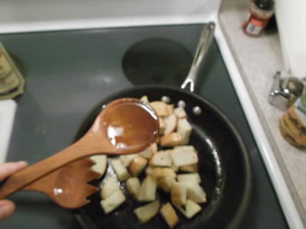 4) agite la sartén de picatostes bastante a menudo para que no se quemen en un lado.