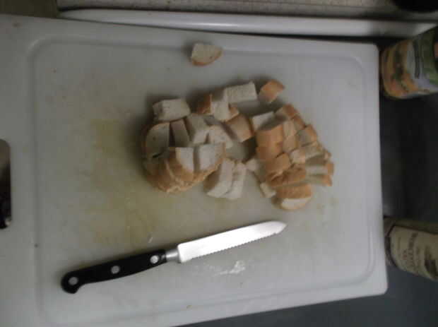 1) cortar el pan en cubos de 1 1/2 a 2 pulgadas.