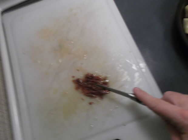 • Finalmente dados / smash en pasta sus anchoas.  Les rasque la tabla para cortar y poner en el bol para mezclar.  Usted puede raspar aceite anchoa callejeros que goteaba de los filetes y poner eso en el tazón de fuente también.