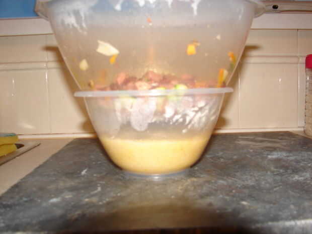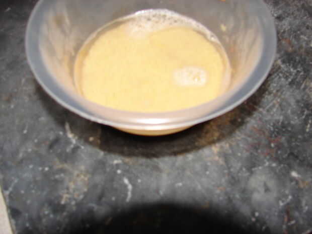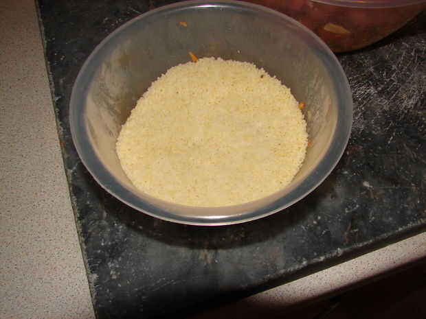 Añadir el couscous en un bol y cubrir con agua que está hirviendo... ponen el otro tazón de fuente en tapa o cubierta con un paño limpio o placa.