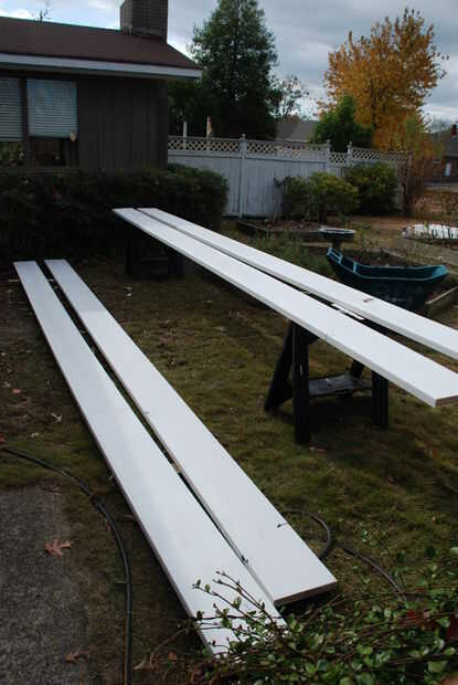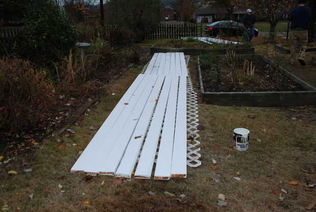 No he podido encontrar tratados con presión de 20 pies de página, por lo que esto significaba que necesitaba para preparar todo.  La parte más difícil estaba tratando de encontrar suficiente espacio para colocar seis 2 x 12 x 20' y 26 2 x 6 x 12' pedazos de madera.  Después preparado cuatro lados, (no prime los extremos ya que todo se reduciría pronto y tendrían que ser pintado luego). Había pintado.