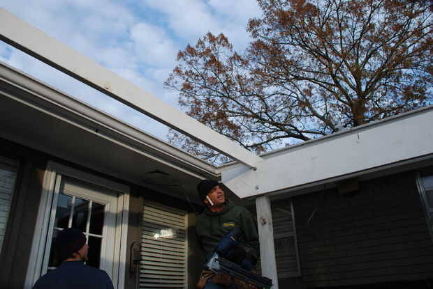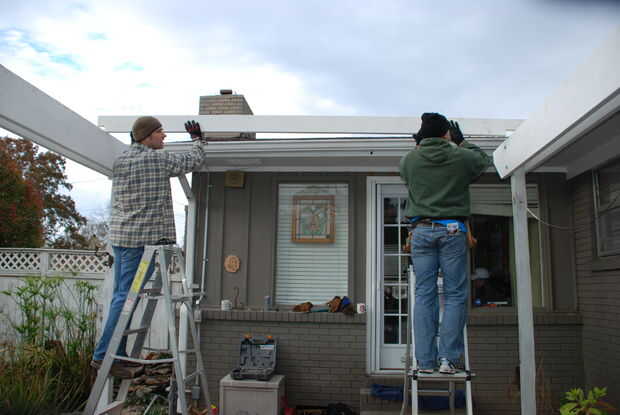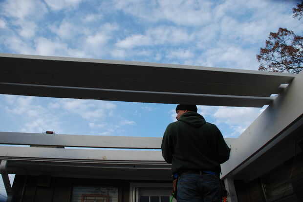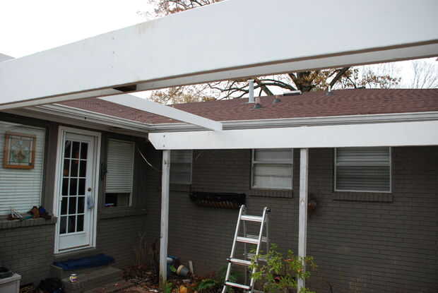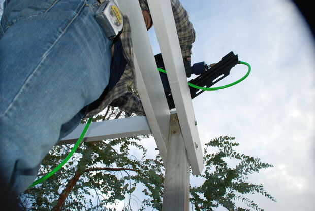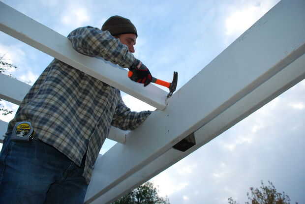 5) empezar a colocar y fijar las vigas.  Atamos con una clavadora neumática.  Nos clavó los pies en ambos lados y cada extremo de la viga.