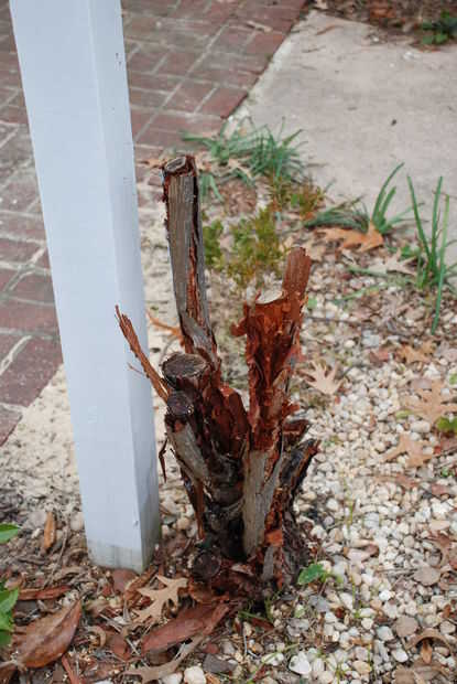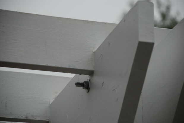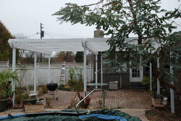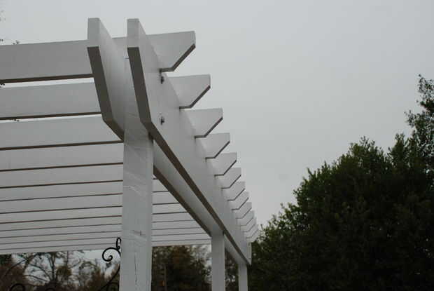 Aunque la señora bancos rosa se reducir a tres pies del suelo, por esta primavera, comenzarán a cubrir el eje.  Mi papá me dice que en dos años serán tan completo como lo fueron siempre.  Afortunadamente, ahora va ser soportadas por una estructura que puede manejar el peso.  Ahora mi papá puede disfrutar de forma segura su vino fuera.