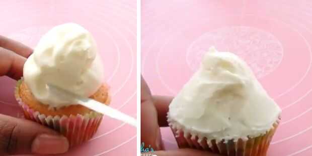 1. prepare su cupcake refrescado por tuberías a un montón de helar y luego alisar los lados para crear una forma de montaña. Asegúrese de que el glaseado es lo suficientemente grueso como para soporte y apoyo el fondant.