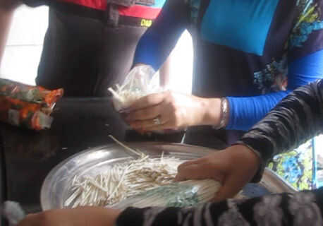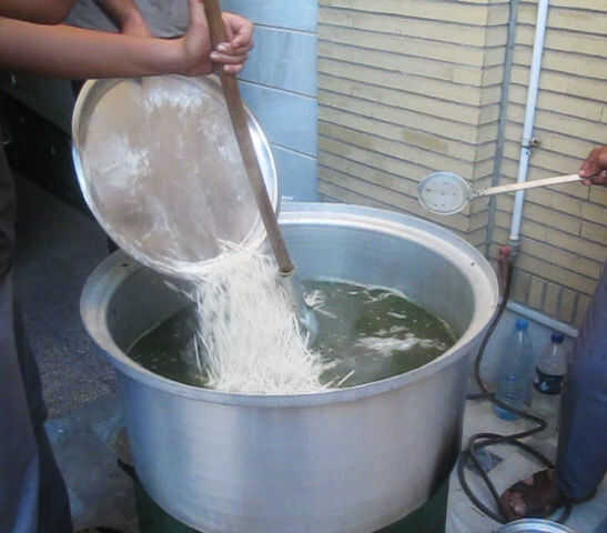 Cortar los fideos en un plato y añadir a la olla. Recuerde que no debe cortar los fideos pequeños. Sólo picar los fideos grandes para el tamaño promedio.